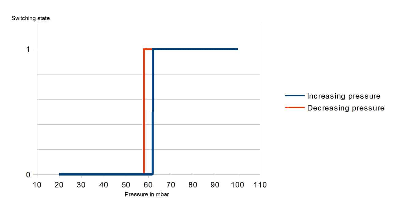 Hysteresis: Pressure switches open and close at different pressure levels. This behavior is caused by the force of the electrical current as well as mechanical forces and is in general desirable. It creates a more stable electrical behavior and also reduces the number of cycles, increasing the life expectancy of a switch. On the other hand, if the hysteresis is too large, there is an increasing grey area where the switching position can no longer be clearly deduced from the pressure level. Each switch therefore has two different graphs, one for increasing, the other for decreasing pressure. Switches with large hysteresis and low requested set point deviation therefore have to be calibrated with the correct graph. Example showing the relationship of pressure and switching position for both graphs: For increasing pressure the switching position is at 62mbar, for decreasing pressure it is at 58 mbar.